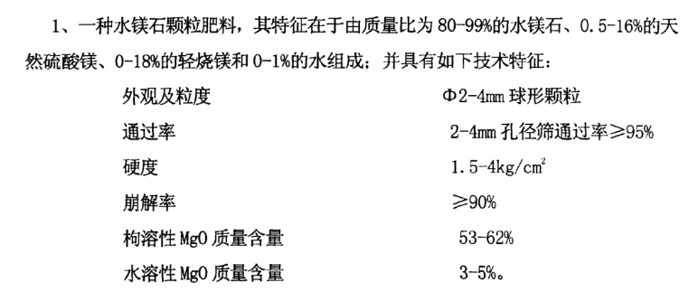 水鎂石顆粒肥料,是將水鎂石、天然硫酸鎂和輕燒鎂混合,用水或者5%(質(zhì)量)的檸檬酸溶液做粘合劑,經(jīng)物料混合、造粒、干燥和包裝步驟制得的直徑φ2-4mm球型顆粒,其中:水分質(zhì)量含量≤1%、硬度1.5-4kg/cm2、崩解率≥90%、枸溶性5%。本產(chǎn)品為純天然產(chǎn)品,顆粒圓潤,均勻,硬度高,崩解性好,與其他肥料混合時,便于混伴均勻,減少粉末污染和減少浪費。