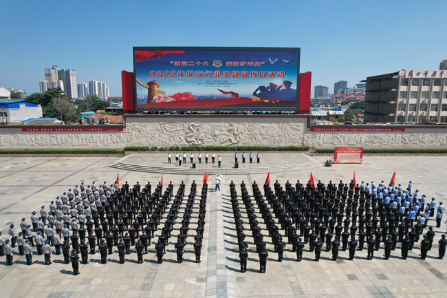 周口城投集團(tuán)黨委副書記、總經(jīng)理潘國華在講話中指出,今年4月,周口市委市政府作出“加快推進(jìn)國有企業(yè)轉(zhuǎn)型發(fā)展做強(qiáng)做大”的重大戰(zhàn)略決策部署,周口市新時代保安服務(wù)有限責(zé)任公司完成國企改革,正式納入市屬國有骨干企業(yè)周口城投發(fā)展集團(tuán)有限公司旗下管理,正式更名為周口安保集團(tuán)有限公司,標(biāo)志著我們將站在一個新的歷史起點,承載更大的安全責(zé)任和使命,服務(wù)周口社會經(jīng)濟(jì)發(fā)展和安全穩(wěn)定。他強(qiáng)調(diào),周口城投安保集團(tuán)作為周口保安行業(yè)的龍頭企業(yè),也是我市唯一一家國有獨資保安服務(wù)企業(yè),要緊緊圍繞平安中國、平安周口建設(shè),聚焦人民群眾對安全服務(wù)的新期待、新要求,積極協(xié)助公安機(jī)關(guān),投身夏季治安打擊整治“百日行動”,全力做好維護(hù)社會治安穩(wěn)定和常態(tài)化疫情防控工作,全力保障黨的二十大勝利召開。他要求,周口城投安保集團(tuán)要以對黨、對人民、對客戶高度負(fù)責(zé)的精神,進(jìn)一步增強(qiáng)保社會平安、促大局穩(wěn)定的責(zé)任感、使命感,踐行初心使命,扛牢社會責(zé)任,融入新發(fā)展理念,不斷提升保安服務(wù)檔次和水平,全力實現(xiàn)安保集團(tuán)在服務(wù)經(jīng)濟(jì)發(fā)展、服務(wù)人民群眾、服務(wù)社會穩(wěn)定上展現(xiàn)新作為、做出新貢獻(xiàn),取得社會效益和經(jīng)濟(jì)效益的雙豐收。全體保安隊員要以此次活動為契機(jī),積極投身維護(hù)社會治安、服務(wù)常態(tài)化疫情防控和保護(hù)人民群眾生命財產(chǎn)安全等各項工作,爭做“保安先鋒”、當(dāng)好“平安衛(wèi)士”,展示保安隊伍紀(jì)律過硬、作風(fēng)過硬、素質(zhì)過硬的良好精神風(fēng)貌。以實際行動和優(yōu)異的成績迎接黨的二十大勝利召開!