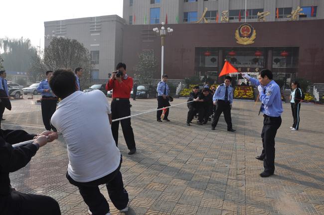 為了慶祝祖國(guó)母親60歲生日,10月1日上午,保安公司派出代表隊(duì)參加市局舉辦的拔河比賽。賽前,公司押運(yùn)經(jīng)理秦平柱對(duì)參賽隊(duì)員進(jìn)行了賽前動(dòng)員,要求大家要以良好的精神狀態(tài)和積極的心態(tài)參加此次比賽。