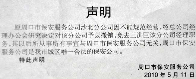 2010年5月14日,周口日報B1版刊登聲明:原周口市保安服務公司沙北分公司因不能規(guī)范經(jīng)營,經(jīng)總公司經(jīng)理辦公會研究決定對該分公司予以撤銷,免去王洪臣該分公司經(jīng)理職務,其以后所從事所有事宜與周口市保安服務公司無關,周口市保安服務公司是我市城區(qū)唯一合法的保安公司。